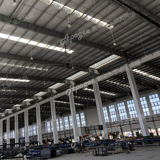示例圖為湖南一家國有企業(yè)生產(chǎn)機(jī)電零部件車間,典型的鋼結(jié)構(gòu)建筑。長度150米, 寬度72米面積10800平米共三跨。 屋面離地高度15米,在沒有吊扇改造前,工廠采用98臺(tái)工業(yè)小風(fēng)扇(強(qiáng)力風(fēng)扇,牛角扇)改善員工工作環(huán)境。 然而高溫季節(jié),環(huán)境溫度34-39度時(shí), 部分小風(fēng)扇應(yīng)用覆蓋距離和面積有限, 部分員工近距離靠著小風(fēng)扇長時(shí)間強(qiáng)風(fēng)環(huán)境下產(chǎn)生不適反應(yīng),原有的通風(fēng)降溫不能解決問題, 另外隨著工廠安全管理需要小風(fēng)扇由于電纜和潛在靠近旋轉(zhuǎn)扇葉的風(fēng)險(xiǎn)也不適應(yīng)工廠未來發(fā)展工廠需要有一個(gè)性價(jià)比高的通風(fēng)降溫解決方案,  根據(jù)工廠要求, 奧寶杰實(shí)地了解原有車間環(huán)境, 從廠房面積, 高度, 設(shè)備人員布局的整體考慮,優(yōu)化吊扇布局和氣流, 使用了18臺(tái)奧寶杰(Apogee) TM-7300 (直徑7.3米)進(jìn)行環(huán)境改善。