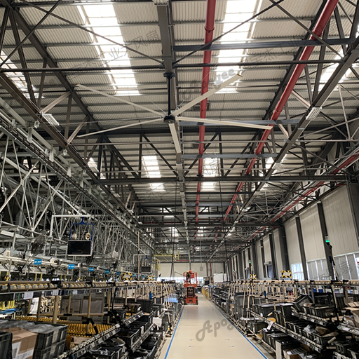 奧寶杰永磁工業(yè)吊扇已經(jīng)在眾多汽車企業(yè)得到應(yīng)用, 無論是大跨度工字鋼廠房,還是球形網(wǎng)架鋼結(jié)構(gòu)廠房奧寶杰工業(yè)吊扇都有成功案例。特別是,對于整車廠面積大, 地面設(shè)備多,物料多特點(diǎn), 奧寶杰采用核心技術(shù)開發(fā)的永磁直驅(qū)吊扇,由于產(chǎn)品重量輕,體積小, 安裝所需空間小,智能控制, 集中控制等優(yōu)勢,永磁工業(yè)吊扇可安裝在各種復(fù)雜廠房環(huán)境。